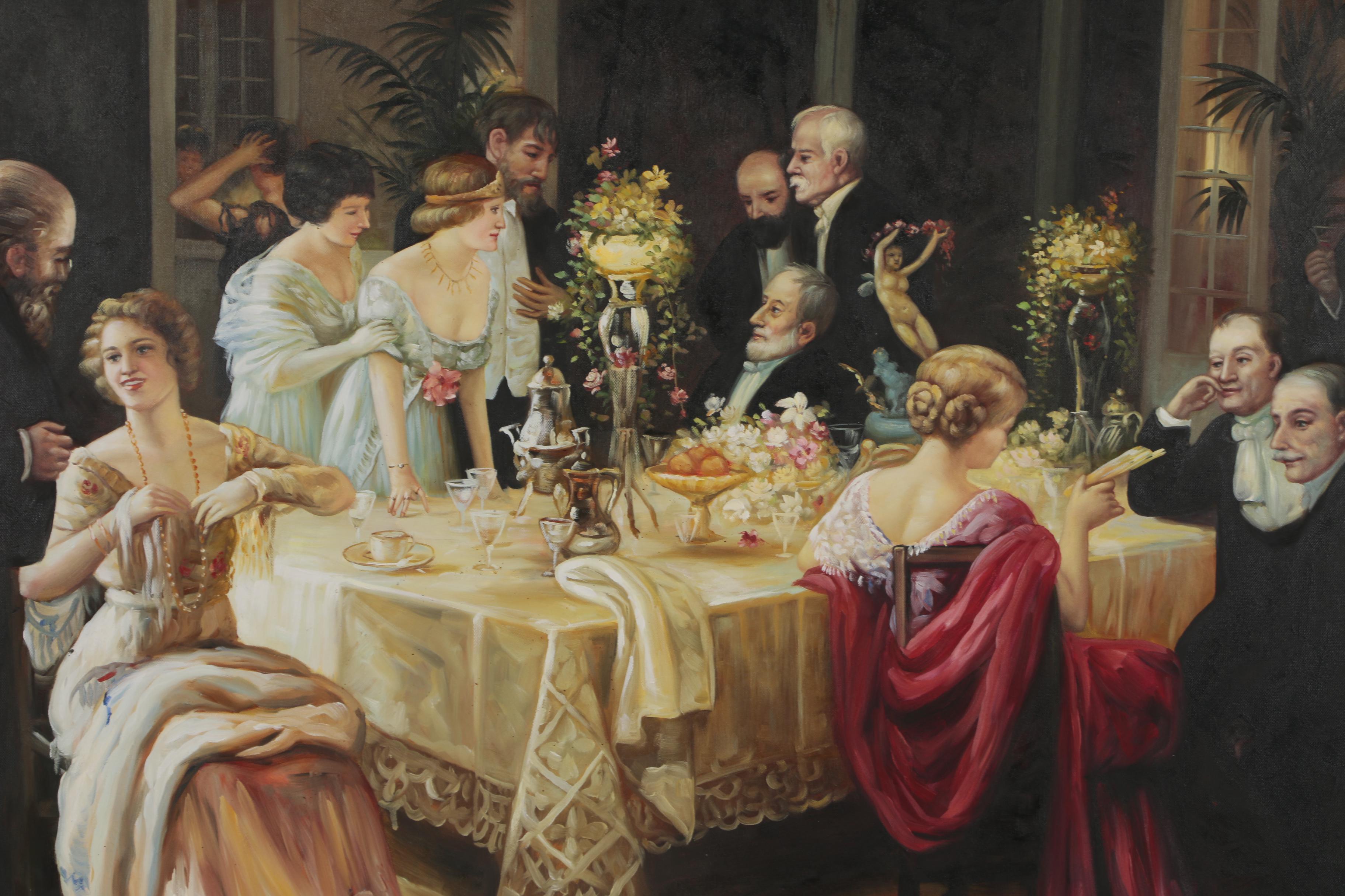 The dinner party society fashionable rich people painting by jules grun repro. Central to the painting is event and art exhibition that takes. Banquet come dine with me victorian christmas victorian art victorian gown victorian paintings victorian ladies vintage christmas christmas tree. You are commissioning a real painting. The dinner party hand made oil painting canvas : (110.5 x 122 cm.)this painting is available to purchase as a handmade oil r. About this painting:this art work from old master jules grun, the original name is the dinner party, the original size is 60 x 90cm, about 23.62x35.43inch, the original medium is oil on canvas,our item number is whj3182. This image of jules grun was kindly provided by don kurtz. Other paintings even if you are not a connoisseur of art, undoubtedly you have heard about this famous painter jules grun & at least once in life, you saw his staggering work the dinner party. The dinner party oil painting by jules grun, the highest quality oil painting reproductions and great customer service! Work sold with an invoice and a certificate of authenticity delivered by master apollon® signature : Fast shipping, custom framing, and discounts you'll love! Oil painting artists will also customize your paintings with special aging and varnishing.